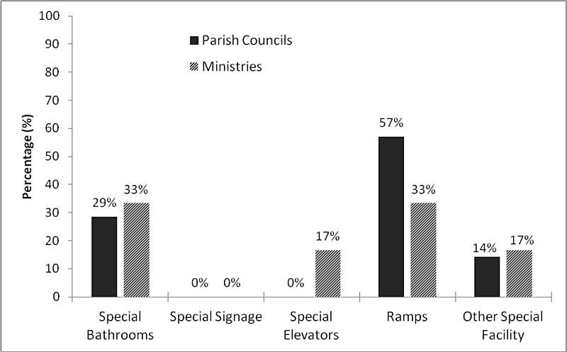 In Jamaica, PWDs face barriers outside of crises and emergencies. From Figure 3 it is notable that only 33% of responding Ministries and 42% of Parish Councils reported having special facilities for PWDs in the workplace. Fifty-eight percent of Parish Councils and 50% of Ministries reported that there were no special facilities for PWDs in the workplace. Sixteen percent of the Ministries who responded said that they were not sure if there were special facilities for PWDs in the workplace. Of those, 29% of Parish Councils and 33% of Ministries had specially equipped sanitary facilities; 57% of Parish Councils and 33% of Ministries had ramps; none of the Parish Councils and 17% of the Ministries reported elevators in buildings with more than one level; and 14% of Parish Councils and 17% of Ministries had other special facilities (see Figure 4). None of the Parish Councils nor Ministries had any special signage for PWDs.