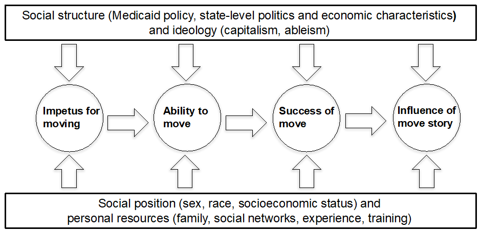 Whereas social position and personal resources are things that individuals draw from, social structure refers to the milieu in which individuals are embedded, shaping and constraining action, and its influence becomes present through both ideology (e.g., capitalism and institutionalized ableism, sexism, and racism), and the consequent distribution of resources via the State through federal, state, and local law, politics, policy, and practice. Acknowledging the significance of the organization of society via capitalism attends to both the social production and social construction of disability (Albrecht 1992; Russell 1998). Additionally, identifying the role of institutionalized ableism as it influences macro-level structure provides an opportunity to look at how this ideology affects both individuals and the social situations in which they are embedded. As with social position and personal resources, social structure and ideology influence each of the four steps along an individual's path to move across states. For example, social structure and ideology impact how, when and why potential or pursued cross-state moves for disabled people are possible. These factors influence: the social, political, and economic distribution of opportunity versus necessity, the possibility of cross-state moves for those who experience residential dislocation due to personal tragedy or natural disaster, the self-assessment of whether or not one is able to move, the pursuit of a cross-state move as imagined or intended, the evaluation of success by both the individual and the systems/programs which they are a part, and the description of the move story to other program users through formal or informal channels.