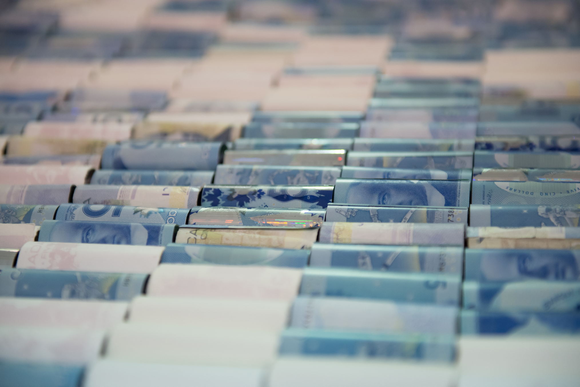 Image Description: A close up of Vanessa Dion Fletcher's piece Relationship or Translation?. The image features five rows of blue and white Canadian five-dollar bills that are rolled and packed closely together in a style reminiscent of a Wampum Belt.