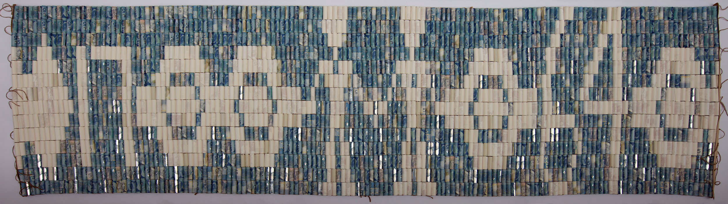 Image Description: An image of Vanessa Dion Fletcher's artwork, Relationship or Transaction? A large wampum belt woven with white patterning on a blue background. Rather than being made of wampum beads, the blue parts of the belt are comprised of rolled Canadian five-dollar bills.