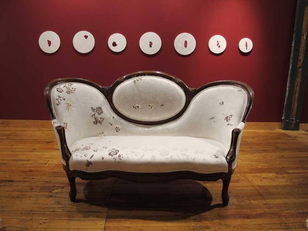 Image description: An image of Vanessa Dion Fletcher's artwork, Own Your Cervix. In this image, a couch stands in front of a red wall in a gallery space. The couch is ornate, covered in white damask with brown wood detailing. Clusters of porcupine quills stick out of the couch, arranged mostly on the sides and back of the couch. On the wall behind the couch, seven fabric circles of varying sizes of the same white damask fabric are arranged in a line; each circle has a streak of blood on it.