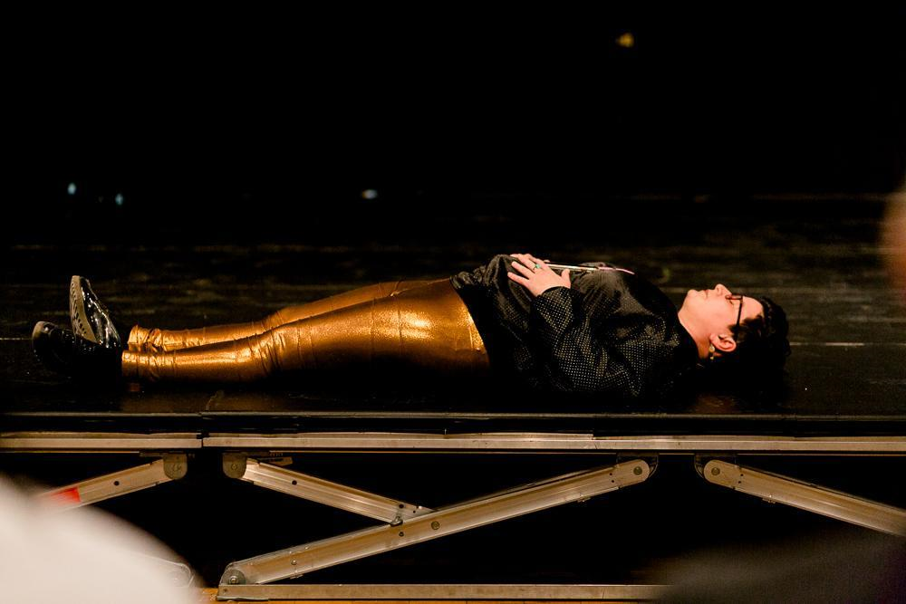 Image description: An image of Vanessa Dion Fletcher's performance, Finding Language: A Word Scavenger Hunt. In this image, Dion Fletcher, an Indigenous woman, is beginning her performance by lying on her back on a low stage. She is wearing black shoes, gold-colored leggings, a black jacket, and glasses. Her hands are placed on her abdomen.
