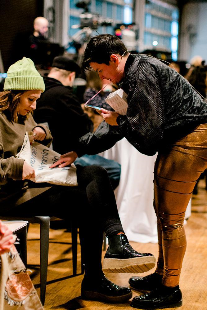 Image description: An image of Vanessa Dion Fletcher's performance, Finding Language: A Word Scavenger Hunt. In this image, Dion Fletcher, wearing black shoes, gold-colored leggings, a black jacket, and glasses, crotches down in front of an audience member who is holding out a tote bag. There are multiple spellings of the word women on this bag. With one hand, Dion Fletcher is pointing to the spelling of the English word that is in focus in this photograph: wommin. In her other arm, Vanessa is holding her English-Delaware dictionary. Her cellphone, which she is using to capture the words she finds and projects them onto a large screen in front of the audience, is strapped around her neck. Vanessa is looking at the words on the tote bag through her cellphone.