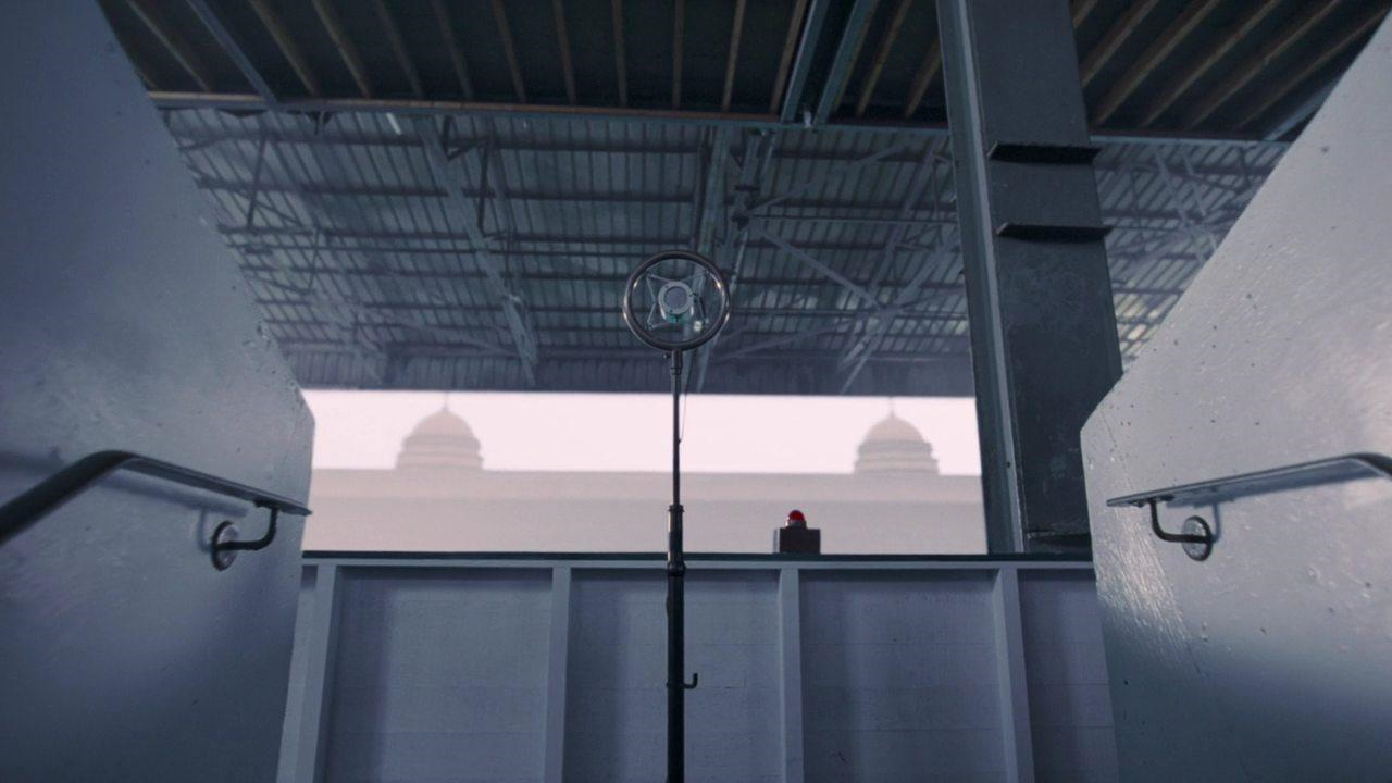 Figure 3. Hooper, The King's Speech (03:26), Anchor Bay Entertainment, 2011. The camera looks up out of the tunnels of Wembly Stadium at a single metal microphone on a vertical stand.