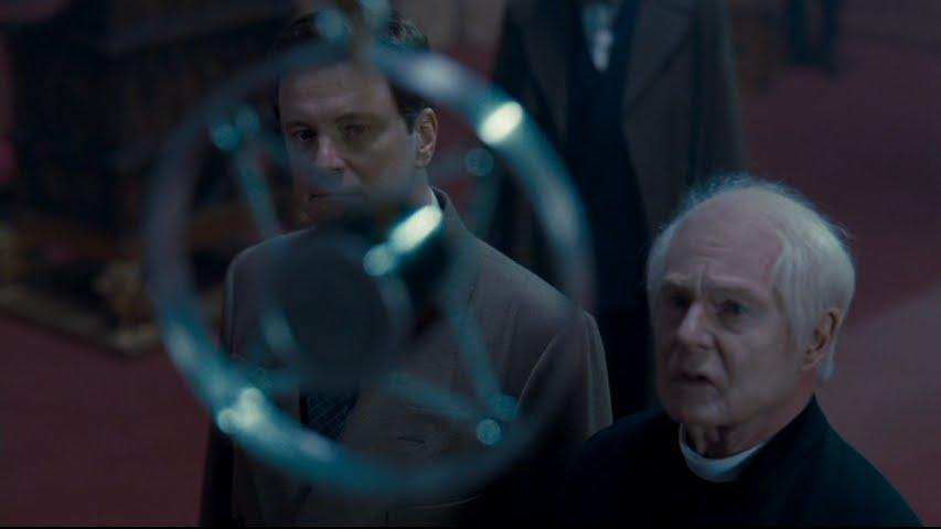 It is a moving cinematic moment, one seemingly orchestrated by Logue to elicit the self-confidence that has thus far eluded Bertie. Now, finally beginning to recognize his own power, he willingly exerts royal prerogative, even pushing back against Archbishop Lang (Derek Jacobi), who tries to expel Logue from the abbey. Lang tells the King, "My concern, your majesty, is for the head on whom I must place the crown." Bertie reminds him, "But it's my head." The line echoes the possessive language he once anxiously applied to his stutter, and more crucially it reorients the focus of his authority upon the corporeal form from which the king's speech emanates. Consequently, the film presents Logue as the catalyst for Bertie's ontological revelation, allowing him to find his voice and move beyond his moment of Shakespearean hesitation as the film shifts into its final act.