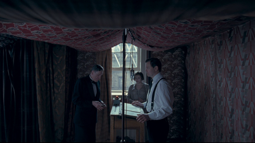 Figure 11. Hooper, The King's Speech (1:41:21), Anchor Bay Entertainment, 2011. In a secluded room covered with tapestries, Logue and Bertie stand facing each other on opposite sides of a suspended microphone with the queen in the background.