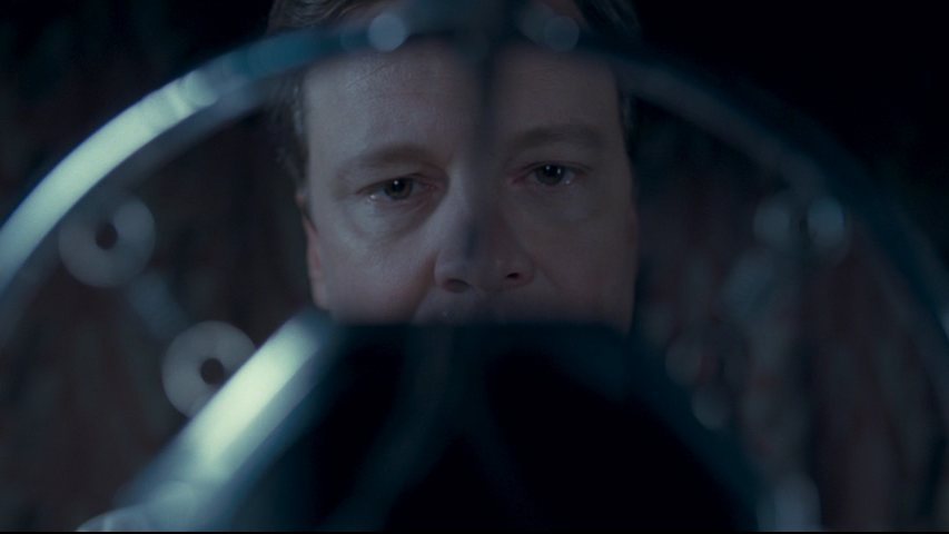 Figure 12. Hooper, The King's Speech (1:41:02), Anchor Bay Entertainment, 2011. A close-up shot of Bertie with all but his eyes obscured by the microphone in the foreground.