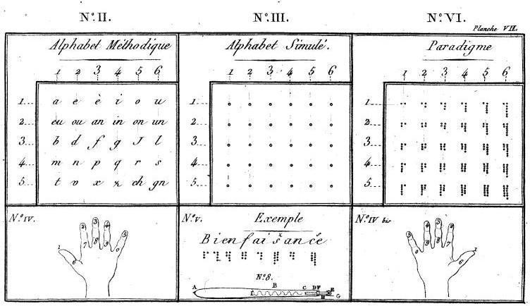 Those who are blind from birth, deprived, like other blind people, of the means of reading books and writing, experience the greatest difficulties in correctly tracing conventional letters; they are restricted to using special methods of correspondence reserved for their use and those of people who take the trouble to learn them. Under these circumstances, the point writing shown in Plate VII [see Figure 2], executed without ink or pencil with a metal punch to impress regular points which can be felt with the hand and which remain sensible to the touch, seems to offer the greatest advantages, but it is only in establishments consecrated to their instruction that one could properly determine the results (Barbier, 1815, 20). 13