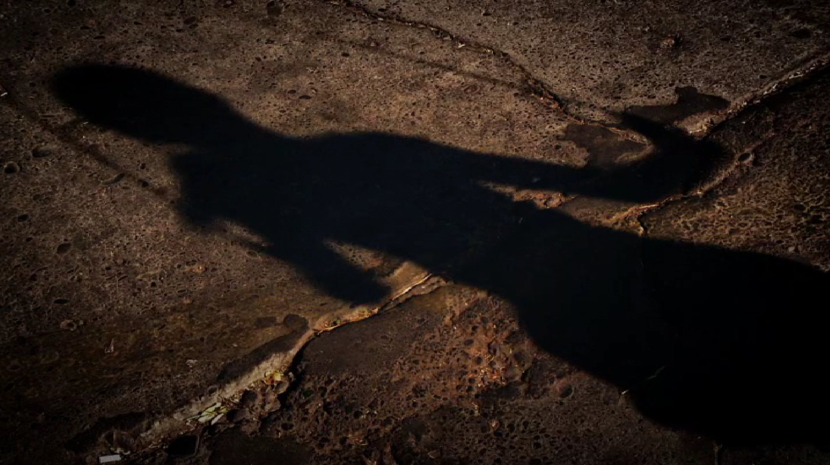 Fig. 1: Shadow Girl Opening Scene – A shadow of a girl jumping rope is cast onto a concrete sidewalk. The color is ochre and sepia, making the image seem like a memory from the past.