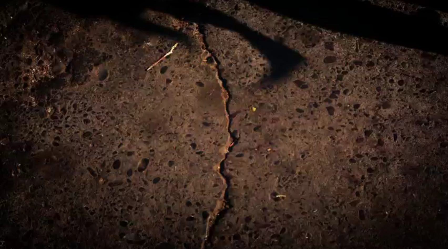 Fig. 2: Shadow Girl Sidewalk Extreme Close-Up – Very close to the ground, the image is no longer recognizable, there are large cracks and a textured surface.