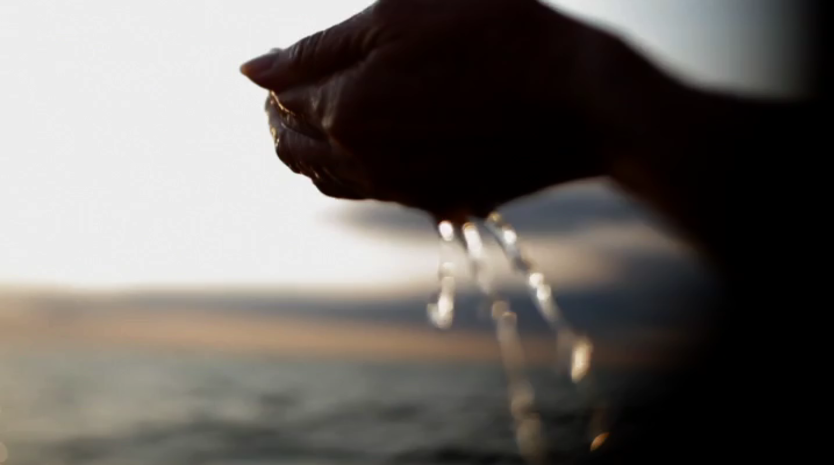 Fig. 5 Shadow Girl Grasping for Water – The filmmaker's hands in extreme close-up, attempting to cup some water which is escaping. Lake Ontario appears in the blurred background.
