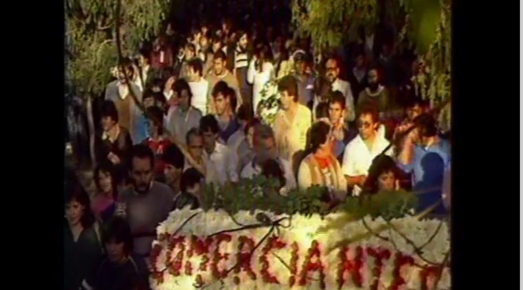 Fig 6. Shadow Girl Inserted VHS Footage of 1980s Street Protests – A low-grade VHS image showing blind vendors marching in Chile. Details are hard to see and the colors bleed into each other, denoting a poor-quality homemade recording.