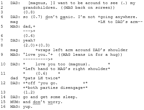 This first analysis examines a case of a cuddle initiated by an autism-diagnosed child. Not only does the child initiate the cuddle with his parent, he shows a sophisticated understanding of the resources available to him and Dad (e.g., turn-taking and sequence orientations as well as bodily/gestural resources) for structuring this interactional moment. Prior to this extract, Magnus has voiced his concern that Dad may die soon due to an injury he sustained. Dad has been reassuring him that he is not going to die. Magnus initiates the cuddle after Dad issues the upshot of this reassurance talk.
