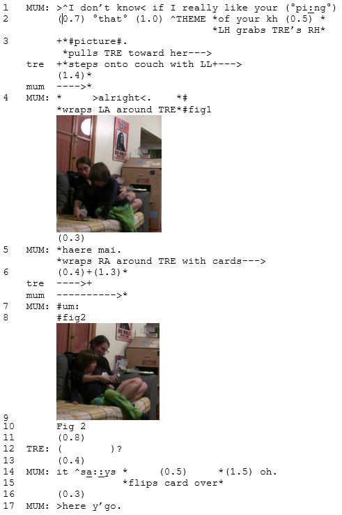 This cuddle is set up in a transition point between activities and directly places Trevor in engagement with the new course of action. Jefferson (1993) discusses the kinds of things that tend to come before topic changes, identifying a speaker's commentary on what has been discussed so far as one of those things. Mum uses her evaluation of the art and story discussed with Trevor as a place to transition to a new activity. Following a 1.4 second silence where Trevor could have addressed Mum's evaluation of his picture and story, Mum utters ">alright<" at line 4. The silence demonstrates Trevor's orientation to the embodied action at hand and dismissal of the previous topic and Mum's utterance verbally marks the transition to a new course of action, as it is not designed as sequentially related to the prior topic or her prior turn (Maynard, 1980). Ultimately this embrace is initiated in such a way that both participants co-construct it as a transition between courses of action, collaboratively designing the cuddle as something mutually engaged in by them both.