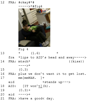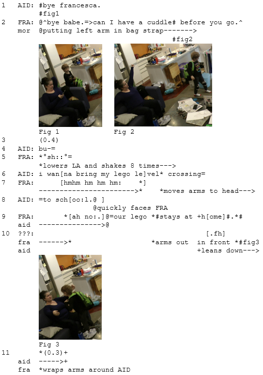 In Extract 3, Aidan is leaving home for school. He has just previously heard the time and from Francesca and recognises he is late. His rushing to go leaves only minimal time for extended farewells, which Francesca chooses to utilise.
