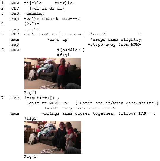 Extract 4 demonstrates how the entrance into affectionate touch is hindered by the local context. Until this point, Mum, Raphael, and Cecilia have been engaged in a chasing and tickling game and this context produces a misalignment in action between Mum and Raphael. At line 1 Mum beckons Raphael with "tickle tickle" and Raphael walks towards Mum at line 3. As he reaches Mum, Cecilia begins shouting " oh ^no no no [no no no] no:.^" at line 4 and this co-occurs with Mum's raising of her hands to receive Raphael and her seemingly re-specifying her activity from tickling (implied by her beckoning at line 1) to now a cuddle at line 6. Cecilia's shouting is much louder than mum's "cuddle?" and it appears to have drowned Mum out in Raphael's ears as he seems still to be playing the tickle game with her. After Mum's arms are raised and she requests a cuddle, Raphael turns away at the last minute and begins to walk away from mum, running to the other side of the lounge. As he runs he is looking behind him at Mum; he is still playing the chasing and tickling game. In this extract, Mum's and Raphael's activities are misaligned. Mum changes course from initiating one activity (tickling) to another (cuddle) but the change is conducted in such a time and place (in the midst of Cecilia's overlapping speech) that Raphael is not party to the change and acts in accordance with the first initiated activity. At this point, the context of play has resulted in a difficulty transitioning into another activity.