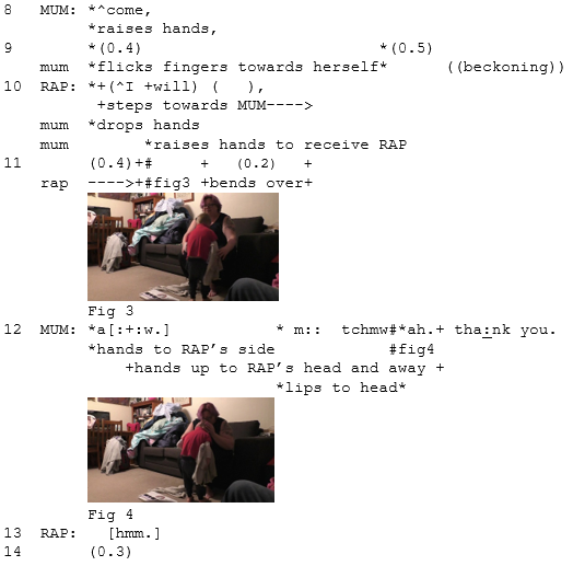 Where Extract 4 showed how the local context of play disrupted a cuddle in the making, Extract 5 shows how Mum and Raphael are able to manage themselves and ultimately achieve their affectionate contact (despite complications). After Raphael has been playfully avoiding Mum on the other side of the room, Mum calls him over at line 21 with "^come," and at the same time raising her arms and beckoning Raphael with her hands. At line 23 Raphael speaks. Much of Raphael's speech is rather high-pitched and unclear. It sounds like he says "^I will" verbally acquiescing, consistent with his embodied response of walking towards Mum. As Raphael walks towards her, Mum raises her arms again before dropping them towards Raphael's side. Ultimately, Mum holds Raphael's head and gives him a kiss. While this is an achievement of affectionate contact, it is not the cuddle Mum initially seemed to be seeking. Remember from earlier that Raphael does not seem to have heard that Mum was after a cuddle as her switch from tickles to cuddles was talked over by Cecilia. As Raphael comes to Mum he bends over which makes his back more easily reachable by Mum. Mum previously had been tickling his back in their tickling/chasing game. Raphael presents his back to Mum in order that she resume tickling like she did in their game earlier because as far as he knows, they are both still playing the game and Mum was still teasing him with tickle threats. Mum's dropping and sudden raising of her arms to holding Raphael's head and giving him a kiss are in-the-moment management of the affordances of Raphael's bodily position as presented to her. This case shows how two parties to affectionate touch in interaction can be misaligned in their action on the basis of their previous actions and broader activity context and address that misalignment on the go so that an approximation of the originally intended action can be accomplished. Here, Mum and Raphael are working under different presumptions of what kind of affectionate touch is on offer based on each other's understanding of the play context they are in (where Raphael perpetuates play after Mum has concluded it) and yet are still able to coordinate such that affection touch is achieved.