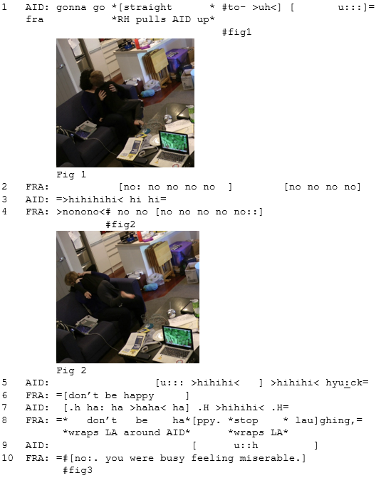 This initial part of the cuddle is oriented towards Aidan's current emotional state and remedying it, specifically by eliciting displays of positive affect from Aidan. At line 1, Aidan verbalises that he is rejecting Francesca's demand that he come to her and is, in fact, on his way to the kitchen for the apple he asked for. Despite this rejection of close contact, Francesca scoops him up as he walks past. Francesca brings Aidan up into a head-to-head formation (Cekaite, & Kvist Holm, 2017). Francesca is thus in control of a participation framework between her and Aidan in which Aidan has little choice but to be the recipient to Francesca's action. Francesca's actions consisted of tickling and talking. The tickling serves to elicit positive affective displays from Aidan, which successfully occurs in lines 3, 5, 7, and 13 where Aidan is laughing. Francesca's talk seems, on the surface, to be inapposite. At lines 2 and 4 she produces repeated "no"s, rejecting and negatively assessing Aidan's laughter, and at lines 6 and 8 she directs Aidan to stop laughter and stop being happy. Considering Goodwin's (2013) notion of lamination, Francesca's overall action must be understood with reference to all semiotic resources she employs. By considering her talk laminated by her tickling, Francesca's directives and rejections of Aidan's positivity are recognisable as teasing and playful. Exactly their inappositeness is what makes them sound like playful teasing rather than genuine directives. During this, Aidan, despite having resisted Francesca's attempts to help with his frustration, is (at this point) fully engaged in the ongoing haptic experience. Though this is not to last, as seen in Extract 7.
