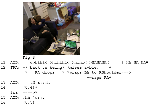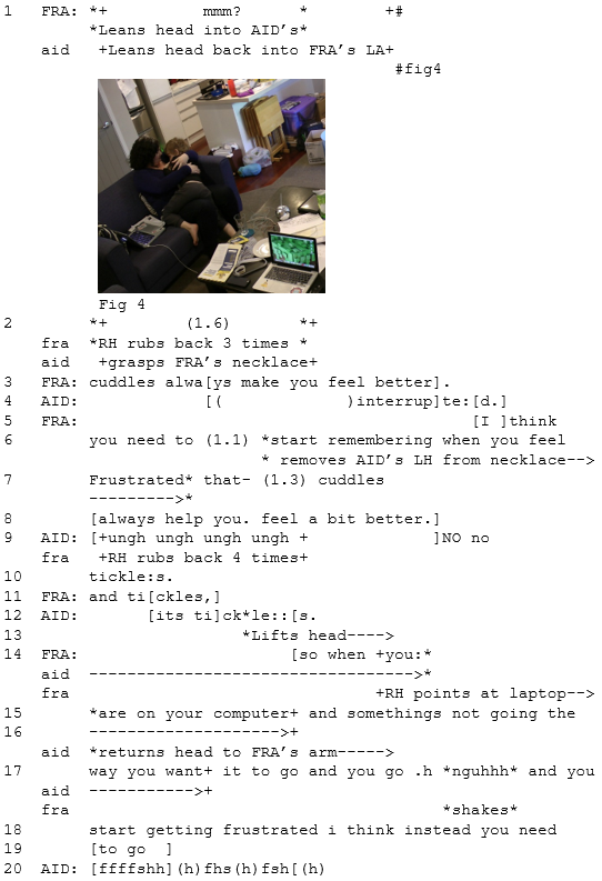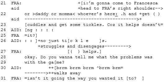 Francesca provides more advice to Aidan about what to do when frustrated and continues to formulate the significant helping component as cuddles. This continuing rejection of Aidan's formulation (that it is just tickles that works), prompts Aidan to ignore her advice and repeat his correction while struggling to withdraw from the cuddle. At lines 14-25, Francesca describes a hypothetical future scenario like what happened earlier (where Aidan is getting frustrated by his computer not cooperating) and suggests in such a scenario Aidan should go to someone and get "cuddles and some tickles" (line 23). She finishes this extended turn by attempting to elicit Aidan's agreement that it (ostensibly getting cuddles and tickles) helps. Instead of agreeing, Aidan overlaps at the end of her turn to say "no just tickles." at line 26. At the same time he begins talking, Aidan struggles free of Francesca. While Aidan is withdrawing from the cuddle, Francesca returns to her initial questioning regarding what was going wrong in the first place but this is ignored entirely by Aidan and she drops it. For Aidan, the cuddle was the environment within which he was not being listened to.