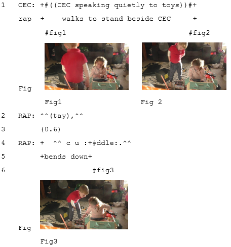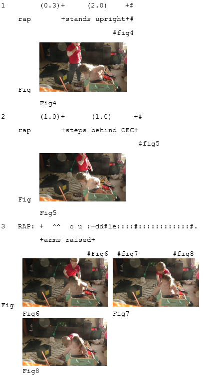 Transcription of multimodal conduct follows Mondada's (2016) conventions. Embodied conduct is positioned on its own lines beneath the co-occurring talk or silences. Onset and offset of embodied conduct is marked by a symbol corresponding to the actor performing it (* for adults, + for child, except in Extract 9 where * is used for Cecilia) on the line of talk during which the embodied conduct happens. When conduct continues across multiple lines, the —-> arrow is used to show this continuation until the corresponding conduct offset symbol. The temporal location of figures is marked on the lines of talk and in conduct lines with a # and the number of the figure.