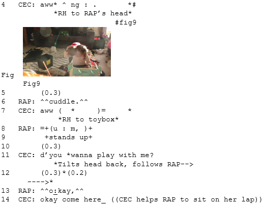 In Extract 8, there is initial misalignment between the two siblings. While Cecilia is engaged playing with her toys, Raphael approaches her at line 1 before bending down to say "^^ c u:ddle:.^^" at line 4. It is unclear at this point whether this was designed as an announcement of Raphael's interest in a cuddle or request, or as an announcement that he was about to engage Cecilia in a cuddle, but what is clear is that he does not immediately engage in the cuddle. This suggests that whatever his turn was exactly designed as, it was at least a first pair part making a response from Cecilia relevant. This is where the initial misalignment occurs as Cecilia does not respond. The fact that Cecilia gives no response, rather than a negative evaluation of Raphael's request/announcement suggests that she is not resisting, she is just engaged in another course of action and prioritising attention on her play.