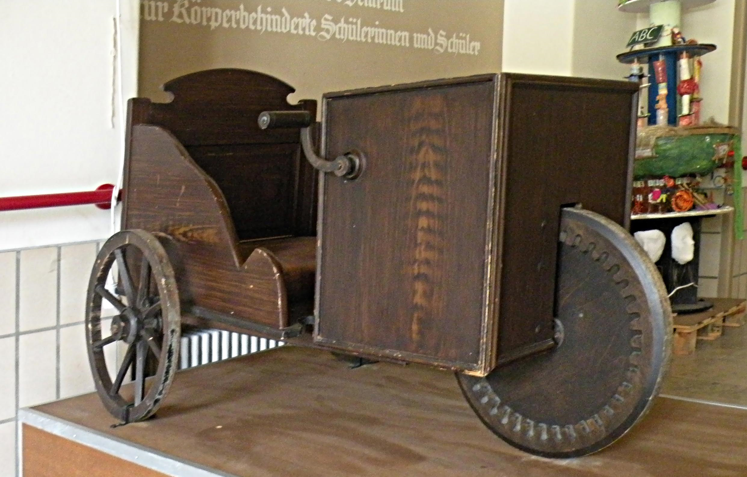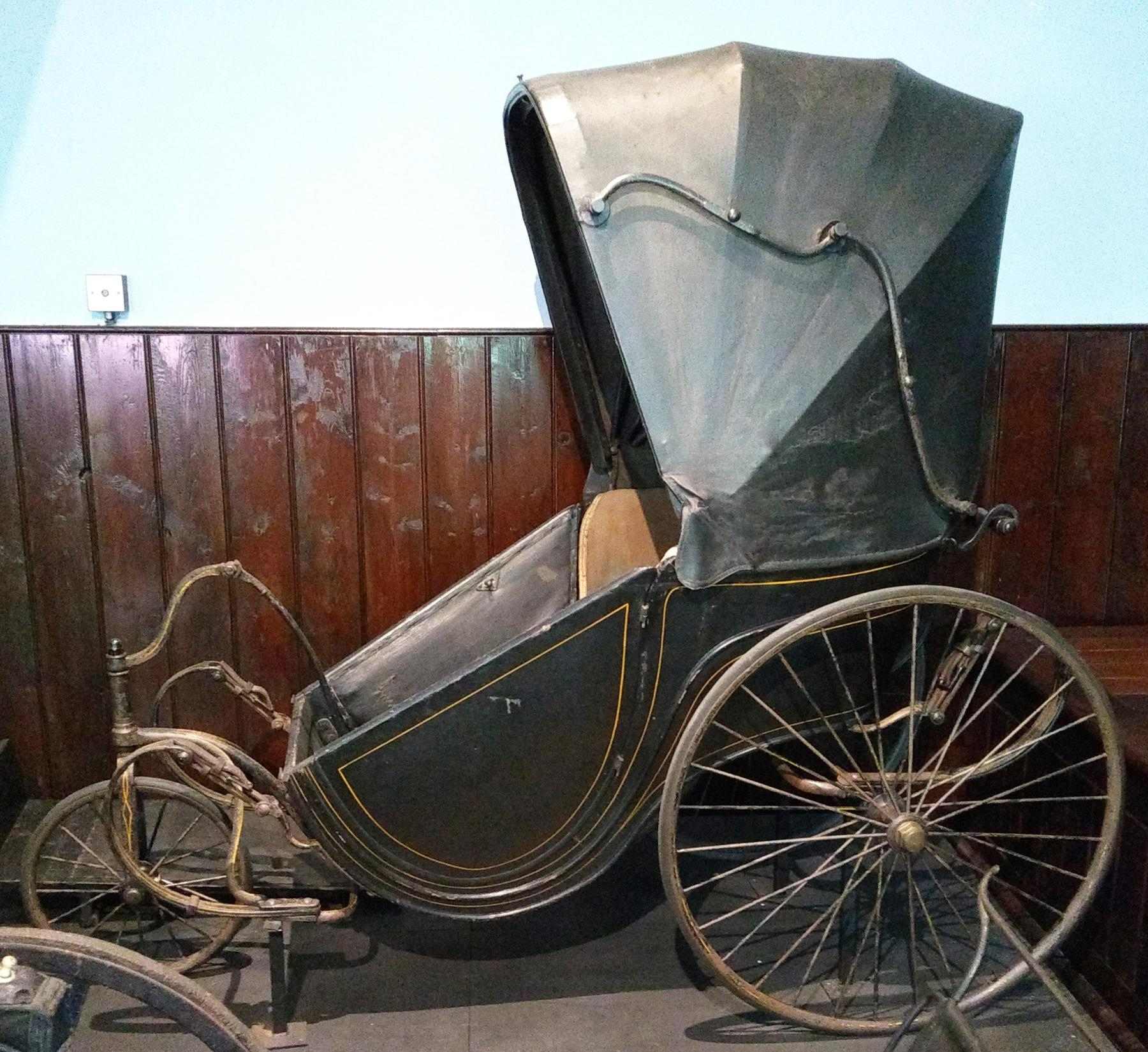 An early example of a chair transporter is the c.1890 3rd Marquis of Bute's "invalid carriage", a quadricycle box drawn by a pony and built by J. Waude of Leicester Square, London (he had chronic nephritis which made him visually impaired). Bute's carriage is on display at the Arlington Carriage Museum in Devon, England. The rear of the box drops down as a ramp allowing a wheelchair to be pushed up the ramp into the box, and the ramp raised and bolted in position. The passenger then drives the pony independently, and is free to choose any desired route. Somewhat different is the Bath chair, invented by James Heath of Bath, England around 1750. The passenger controls the steering but relies on someone behind to push the chair. Bath chairs dating to the nineteenth century often had a folding hood that could be raised during inclement weather, suggesting that its use was valued at all seasons and in all weathers. The Bath chair on display at the Arlington Carriage museum in Devon originally belonged to Julia Lloyd, founder of Scope (formerly know as the Spastics Society – a name significantly changed at the time the Social Model of Disability became accepted) (figure 2A). Historically, bath chairs became a common sight following major wars as large numbers of people suffered war-time injury.