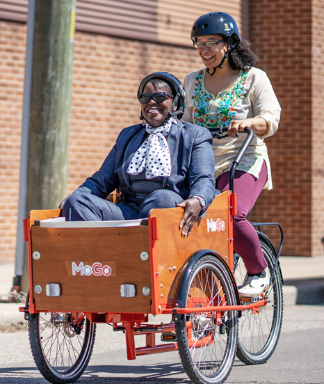 A modern variation of the box transporter, except that the motive force is a cyclist riding behind the wheelchair passenger, is a variation on the Dutch cargo cycle (short box) recently adopted by Detroit's MoGo bicycle rental company (figure 2B). The MoGo has three wheels for stability, with the ramp placed at the front of the box; the passenger plays a passive role. Draisin, a German maker of cycles for disabled persons, also has a chair transporter (the Draisin Plus): it has a detachable light wheelchair fastened via a shock absorber at the front. Draisin stress that "the design of the wheelchair-bicycle combination … has evolved and matured over the years" as feedback from users was incorporated into the design (https://draisin.de/produkte), as anticipated by social models of technology.
