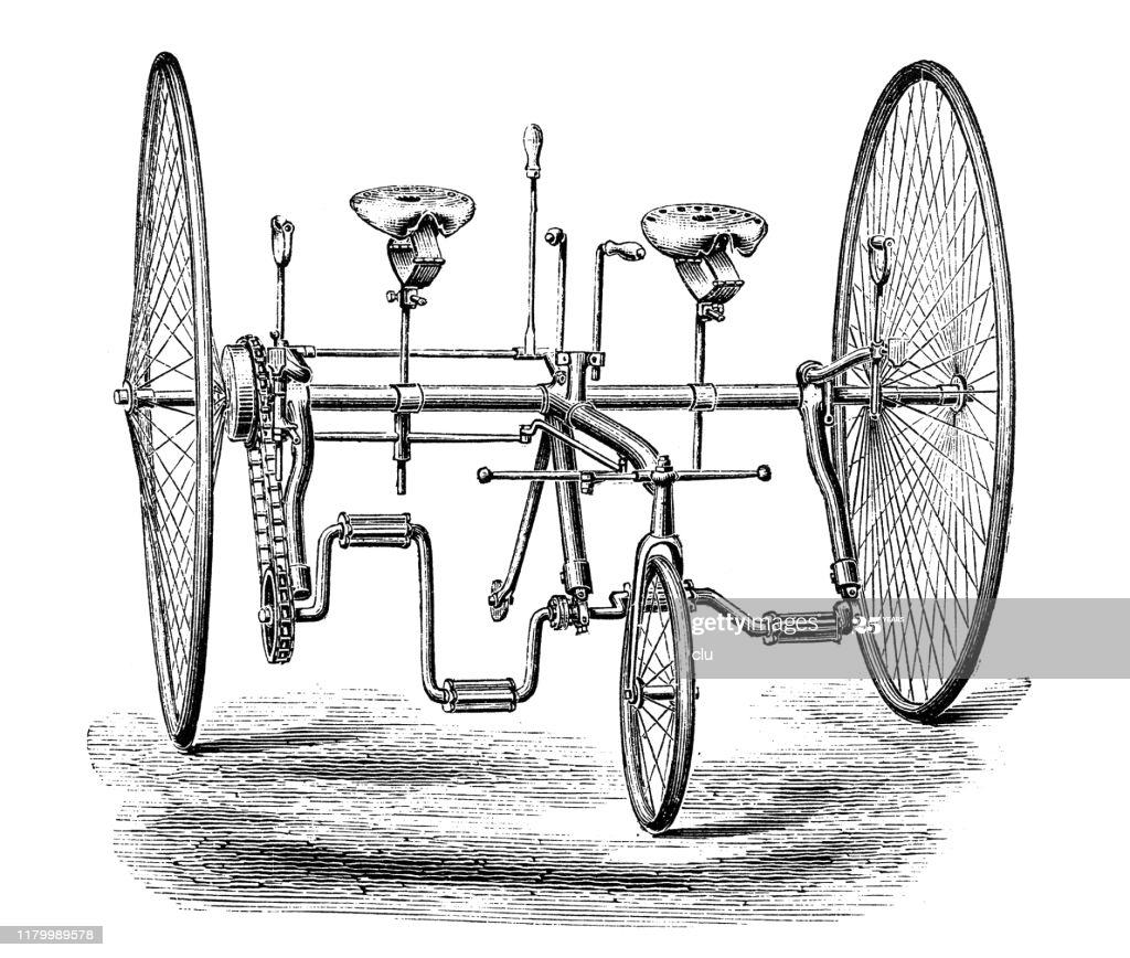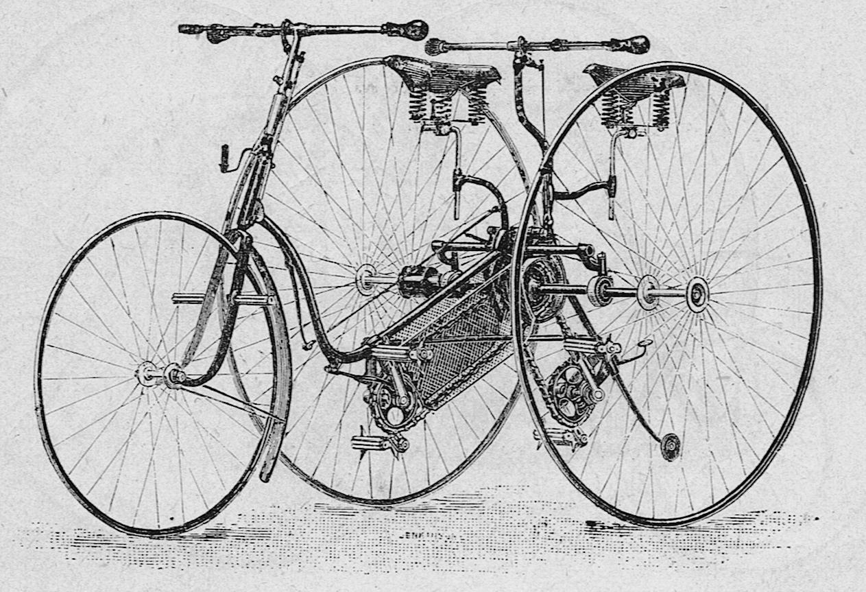 Sociable tricycles, where the riders sit side-by-side, appeared in the 1880s, mainly being marketed to courting and newly married couples. Riding side-by-side was evidently a bonding experience. But, of their nature, they offered possibilities for riders with disability. The first such model, invented in James Starley's workshop in Coventry, appeared in 1878 (figure 3A). Being heavy and wide, they would not pass through normal doors, and since the bent axle with the pedals was a single unit from side to side, both riders had to maintain the same cadence, which could stress both riders.