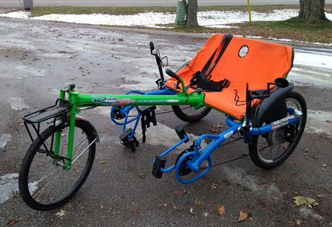 Recent versions of the sociable tricycle such as the RickSycle (figure 3B) that are designed for disabled persons divide the axle into two separate units, so that each side of the sociable has separate gearing and the two riders can maintain different cadences. A tired rider pedals at her/his own cadence, or rests while the pilot does all the work. Some models allow the pedals to lift aside to improve access, and seat belts may be fitted for safety. Brightly colored materials are used to improve visibility.