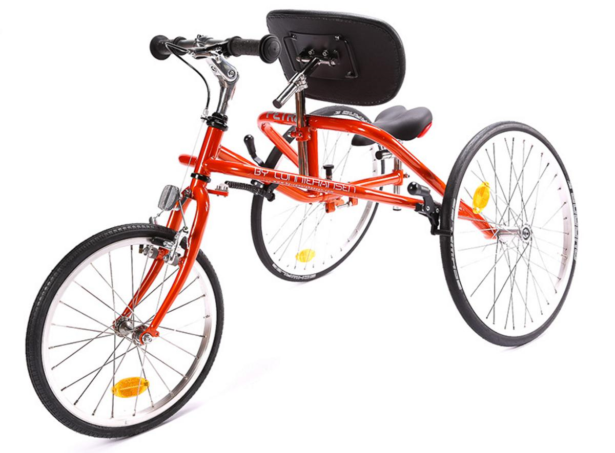 An example of a stable tricycle is the Adventurer, made by Freedom Concepts of Winnipeg, MN. This tricycle has back support, foot straps and an extra wide split back axle with one driving wheel and one freewheel, thus avoiding a differential. Despite the high riding position, it is hard to tip, it has very low gearing and Velcro straps which hold feet on the pedals. A seat belt keeps the rider in the high seat. In an interview, Freedom stressed that their designs are constructed in consultation with medical professionals, therapists, and the families of users, and that further customization is always possible (https://www.freedomconcepts.com/about-us/ accessed 26/6/2020).