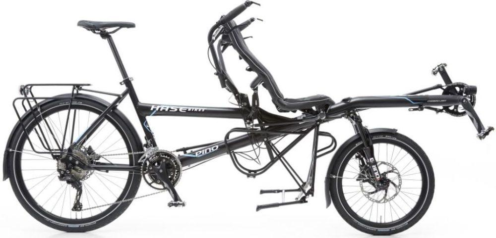 A limitation of the classic tandem such as the Marlboro' Club Tandem tricycle (figure 5A) is that the stoker and pilot have to maintain the same cadence, which may require a compromise over speed between the two riders; newer models with clutch drives allow independent pedaling, although when tandem riders pedal at different cadences the asymmetry of movement affects balance. A recent advance, technically, is the Circe Cycles Helios tandem made in Cambridge, UK that, with low step-over height and easy size adjustment, allows both young and adult riders to exercise. The Hase Bike Company of Bochum in Germany includes in its range of bikes the Pino, which places the front rider in a low semi-recumbent position, with the pilot behind and above (figure 5B): the Tour version of the Pino empowers disabled persons to undertake long-distance tours.
