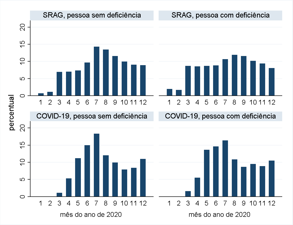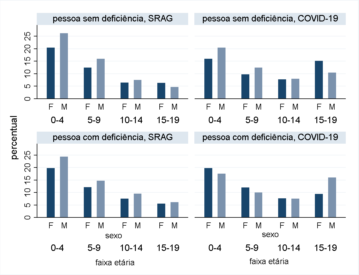 Esta pesquisa tem por objetivo o levantamento e análise dos dados referentes a crianças e adolescentes de 0 a 19 anos, considerando a população com e sem deficiência, em relação aos casos de SRAG (Síndrome Respiratória Aguda Grave) e COVID-19, durante o ano de 2020. O banco de dados utilizado é o Sivep-Gripe, disponibilizado pelo Ministério da Saúde. O banco não apresenta uma variável a respeito da deficiência e foi criada uma proxy a partir da variável binária de Síndrome de Down e da análise qualitativa dos termos clínicos lançados no campo morbidade descritiva. Essa limitação impede a consideração da vivência da deficiência enquanto interação entre os impedimentos corporais e o ambiente, bem como a generalização a respeito dos casos nesta população. As variáveis de análise contemplaram características individuais, regionais e de progressão dos casos, como necessidade de hospitalização, internação em UTI, uso de suportes ventilatórios e evolução dos casos para a cura ou óbito. Foram considerados 83.491 casos de crianças até 19 anos. Desse total, 2.730 (3,27%) foram categorizados com proxy de deficiência. As análises demonstram as diferenças entre os casos e progressões entre crianças e jovens sem deficiência e por tipos de deficiência, sendo as maiores proporções de casos de Covid-19 encontrados entre aquelas com deficiência física e intelectual ou psicossocial. Considerando as faixas etárias, encontramos, no geral, maiores frequências desses casos entre aquelas até 4 anos de idade; entre 5 a 9 anos, maiores proporções de crianças com deficiência intelectual ou psicossocial; e daquelas com deficiência física entre 14 a 19 anos. As progressões dos casos das crianças demonstram a relevância da consideração da deficiência e as vulnerabilidades vivenciadas por esta população, e seus efeitos sobre os estabelecimentos hospitalares, uma vez que são mais suscetíveis a serem internadas, necessitarem de internações em UTI e suporte respiratório. Mesmo com a utilização desses recursos para manutenção da vida, a proporção de crianças com deficiência que evoluem a óbito é equivalente a mais que o dobro (nos casos de COVID-19) e ao triplo (casos de SRAG) daquelas sem deficiência. Com base nessas verificações, ressalta-se a necessidade de estudo, planejamento e execução de políticas públicas que tenham por alvo a população de pessoas com deficiência, especialmente em relação aos serviços de saúde no atual contexto de aumento de casos de COVID-19 e suas variantes pelo país. Além disso, buscamos contribuir para as discussões acadêmicas que abordam a deficiência enquanto relevante marcador social que perpassa as diferentes camadas de desigualdade e exclusão social, desnudadas e aprofundadas no contexto pandêmico.