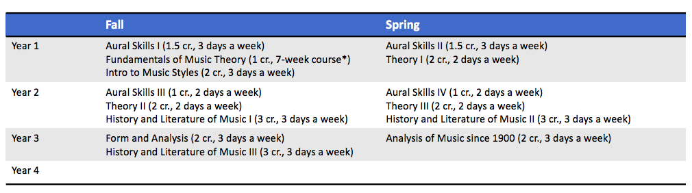 In the second year of music theory study, students choose from a set of courses in Topics in Tonal Theory and Analysis (loosely defined by music that is chromatic, yet tonally-based) and Topics in Post-tonal Theory and Analysis. While individual courses are still being designed for this curriculum, some possible electives for Topics in Tonal Theory and Analysis include: Formal and Cultural Analysis of Popular Music, Jazz Harmony and Analysis, Schenkerian and Structural Analysis, and The Tonal Language of Musical Theatre, among others. Whereas the aforementioned classes are weighted at three credit hours apiece, Topics in Post-tonal Theory and Analysis is only a two credit-hour course. This difference enables us to deliver the Theory curriculum in 12 credit hours, which includes the Fundamentals course. However, Topics in Post-tonal Theory and Analysis would still meet three hours a week in order to provide a space for extended guided listening sessions, since the premise underlying this course is to teach students to grapple with unfamiliar music. As such, "Post-tonal" is obviously a less-than-ideal name for courses which could include diverse topics like: Set theory, Serialism, and the Debates of 20th-century Music; Context and Analysis of Non-Western Musics; Analysis of Jazz in Post-Tonal Languages; and Music of Living Composers.