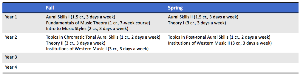 While the Theory core has been successful for many years, some students (especially those entering college with limited music notation skills) struggle to complete the curriculum. These struggles are compounded by the limited face-to-face time in early Theory classes. Meeting two days a week does not provide enough guided practice for some of our students to form a solid foundation in Theory, and hence these students spend most of the core struggling to catch up. Further, the rigidity of the current curricular design creates difficulties for students who fall behind to complete coursework for graduation. To open the core to diverse students and pre-collegiate experiences, we decided to redesign the core from the ground up.