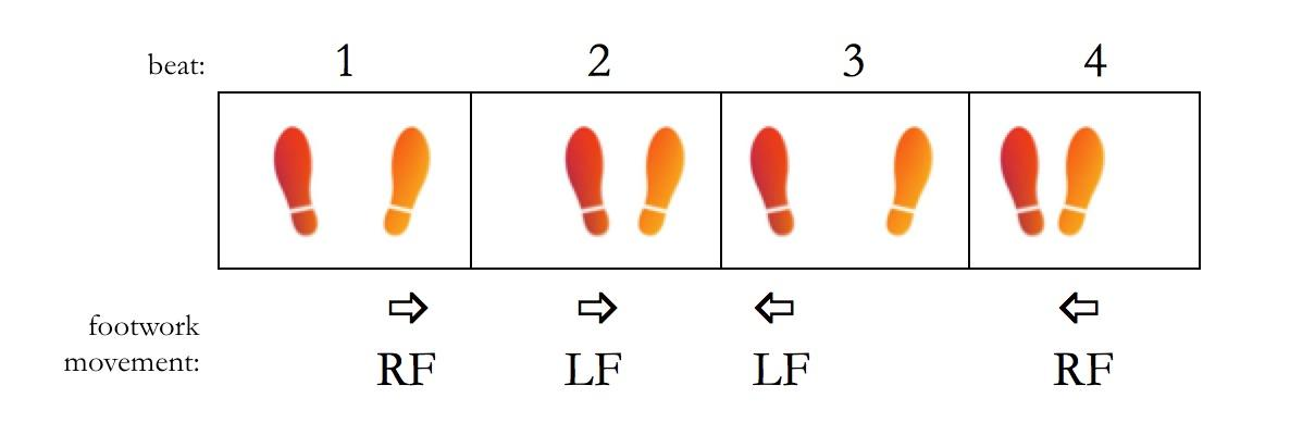 We stand and form a circle around the periphery of the classroom, facing center. We warm up by stepping together in the pattern right foot (RF) out—left foot (LF) in—LF out—RF in (Figure 1). I encourage everyone to let their arms swing freely, to smile, and to breathe deeply.
