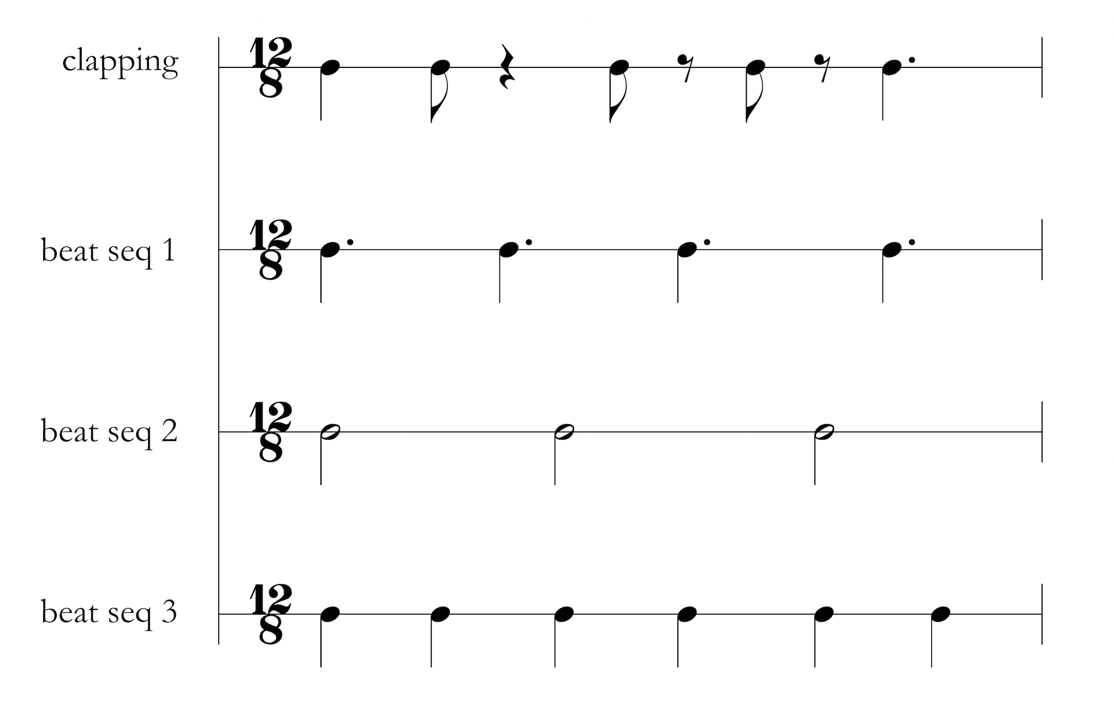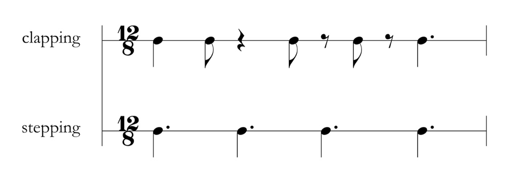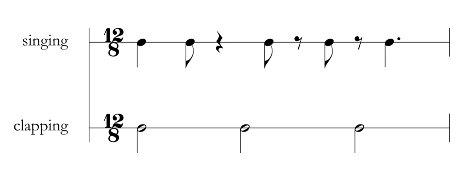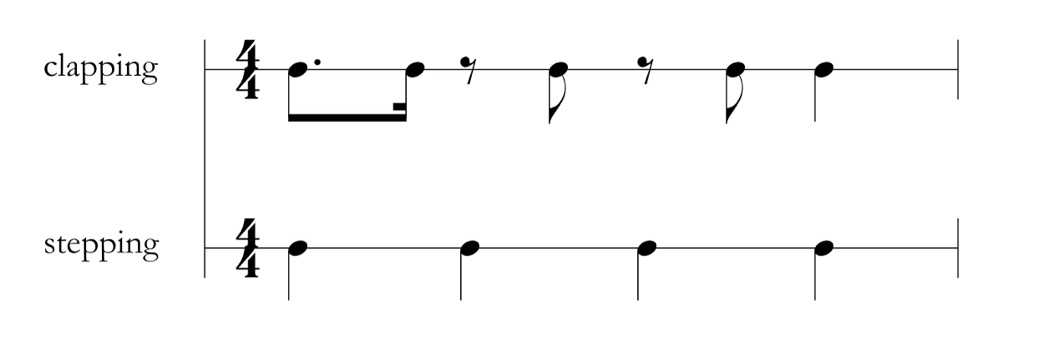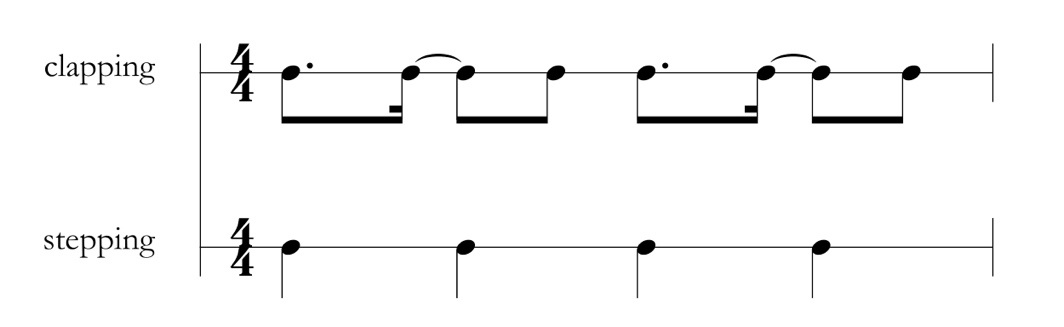 We pause again. Now we're going to come at the same context but framed (and performed) somewhat differently. I ask the class now to sing the clapping pattern, and to clap the beat sequence they were previous stepping. This is usually comparatively easy, having been clapping and stepping this pair of patterns for some time. I then ask them to stop clapping but keep singing, at which point I clap the following sequence (Figure 4, bottom staff), inviting them to join in once they've heard it a few times.
