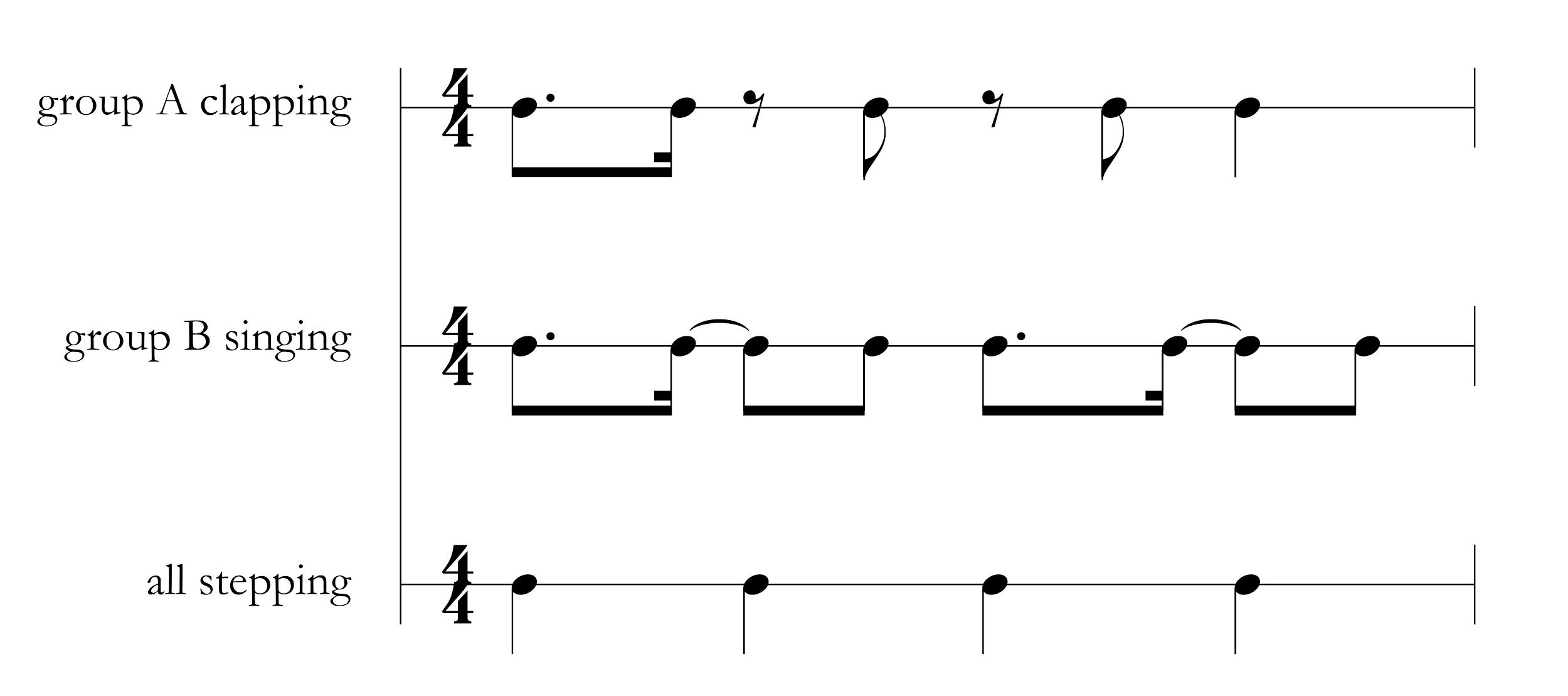 The last step of our introductory project is the most abstract and challenging, but amplifies what is at stake in feeling and hearing multiple meters. We divide this time into four groups. We all resume stepping, RF out—LF in—LF out—RF in. Group A sings the original twelve-pulse version of son clave. Group B claps the six-count metric stratum. (It's important, I think, to be redistributing tasks in various ways so that everyone experiences different combinations in a directly embodied way, and I frequently reassign different parts to different participants in different combinations, and to redistribute the groups themselves.) The two groups repeat this configuration several times. They then stop, everyone still stepping, and group C sings the sixteen-pulse version of son clave while group D claps tresillo. We switch back and forth between the two, hearing and feeling the shift from twelve-pulse to sixteen-pulse cycles, all articulating along a consistent four-count stepping pattern.