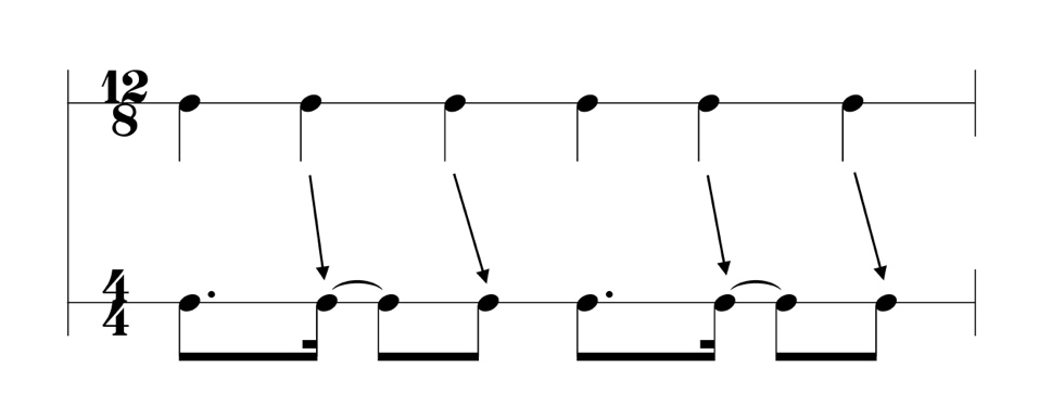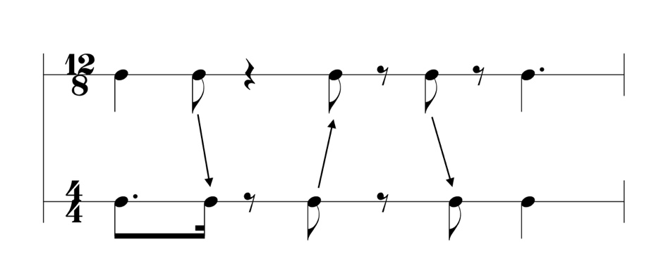What is important here, and a little more difficult to comprehend at first, is that tresillo similarly stretches the six-count metric stratum from our initial foray (Figure 10, shown by arrows). A better way to put this is that, in both cases, each version is a stretched form of the other: there is no priority between the two. In the case of the six-count metric / tresillo relation, the cycle beginning and halfway point share equivalent onsets, resulting in a different kind of directional impetus.